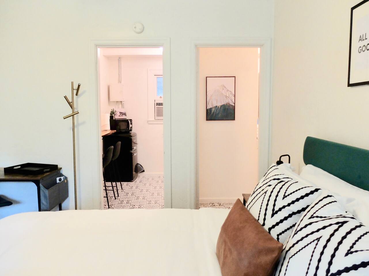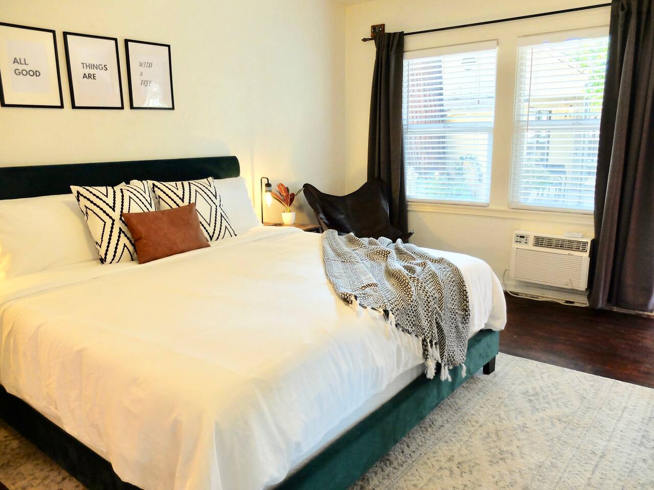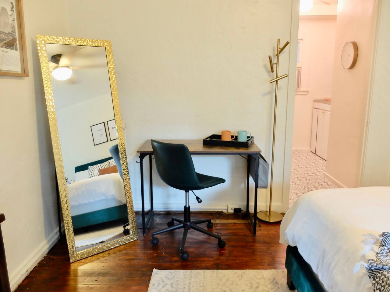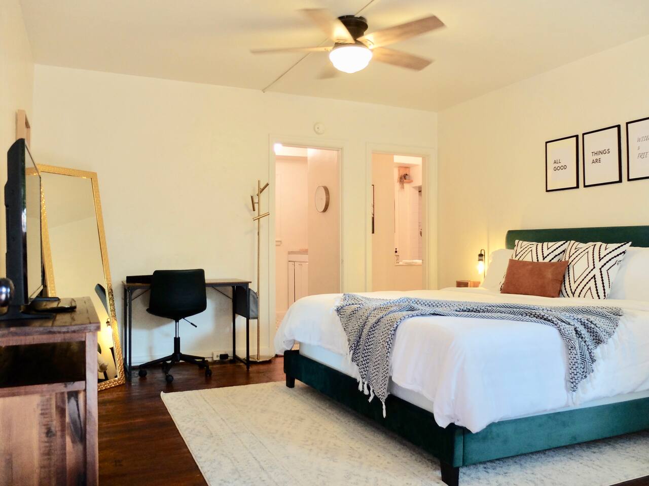 This studio takes a classical hotel room and elevates the space into a cozy, New York City-style studio! Complete with light touches of artwork and greenery, this location has the pleasant feel of an elegant apartment. Upon entry, the raised, foam-mattress, king-sized bed is the most impressive feature of the suite. The above-average sized area also comfortably fits a desk, trendy bedside chair, and well-placed television, perfectly situated for people to relax and watch beloved shows and movies! To the right of the bedroom is a bright bathroom with a tiled, walk-in shower, and to the left is a kitchen area with a bar-top, wall-installed table and two chairs. The compact refrigerator, convection oven/air fryer, hot plates, and other kitchen amenities provide a great space for guests who want to make a few meals on their own to mix things up while on vacation! Other perks of this room include: - WiFi -FireStick TV - A/C and heating unit - large wardrobe mirror - FREE on-site parking (limit: one car) - A perfectly serene location only steps away from fabulous restaurants and local shops.