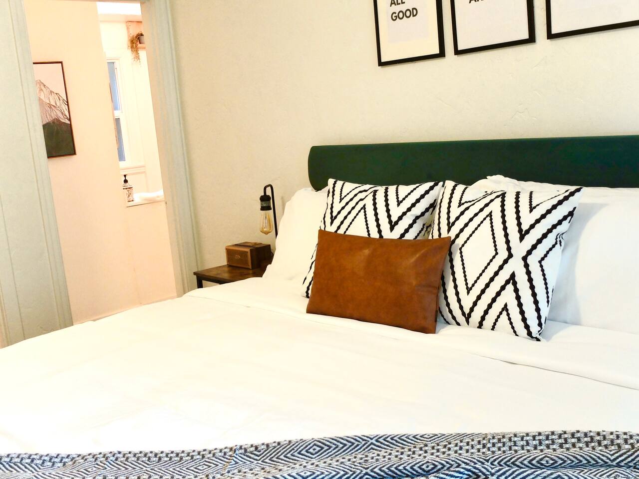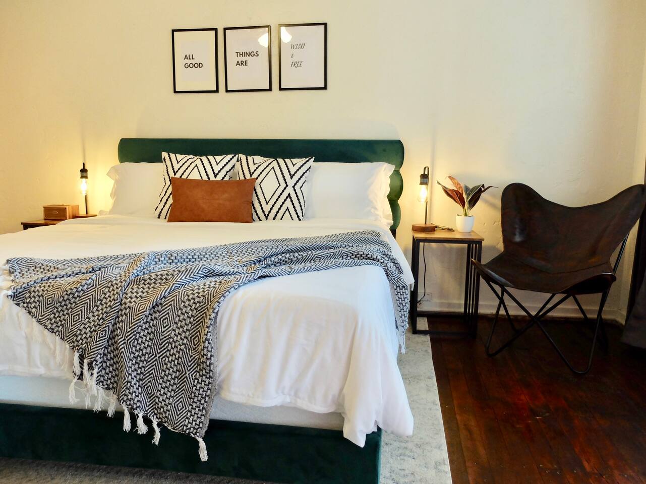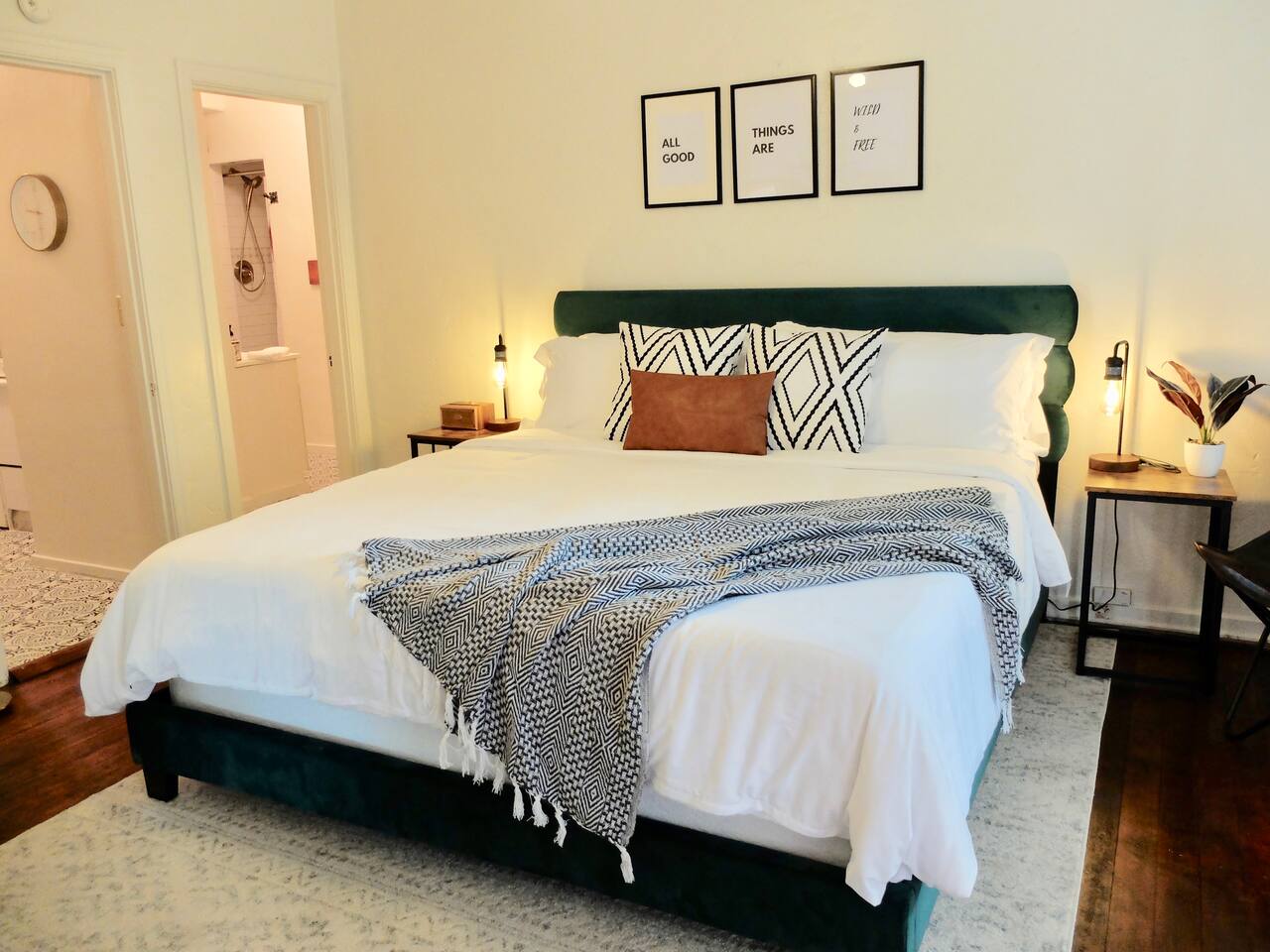 This studio takes a classical hotel room and elevates the space into a cozy, New York City-style studio! Complete with light touches of artwork and greenery, this location has the pleasant feel of an elegant apartment. Upon entry, the raised, foam-mattress, king-sized bed is the most impressive feature of the suite. The above-average sized area also comfortably fits a desk, trendy bedside chair, and well-placed television, perfectly situated for people to relax and watch beloved shows and movies! To the right of the bedroom is a bright bathroom with a tiled, walk-in shower, and to the left is a kitchen area with a bar-top, wall-installed table and two chairs. The compact refrigerator, convection oven/air fryer, hot plates, and other kitchen amenities provide a great space for guests who want to make a few meals on their own to mix things up while on vacation! Other perks of this room include: - WiFi -FireStick TV - A/C and heating unit - large wardrobe mirror - FREE on-site parking (limit: one car) - A perfectly serene location only steps away from fabulous restaurants and local shops.