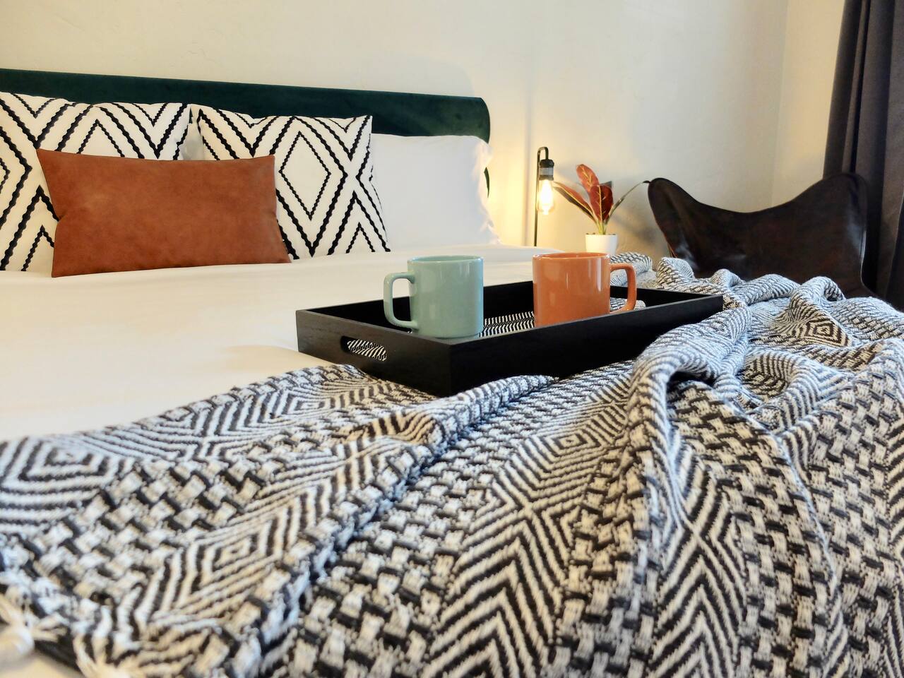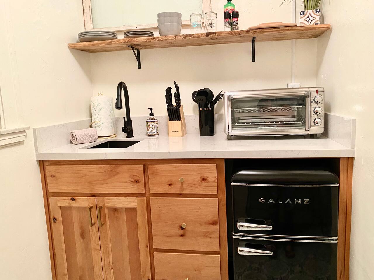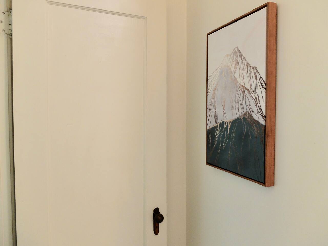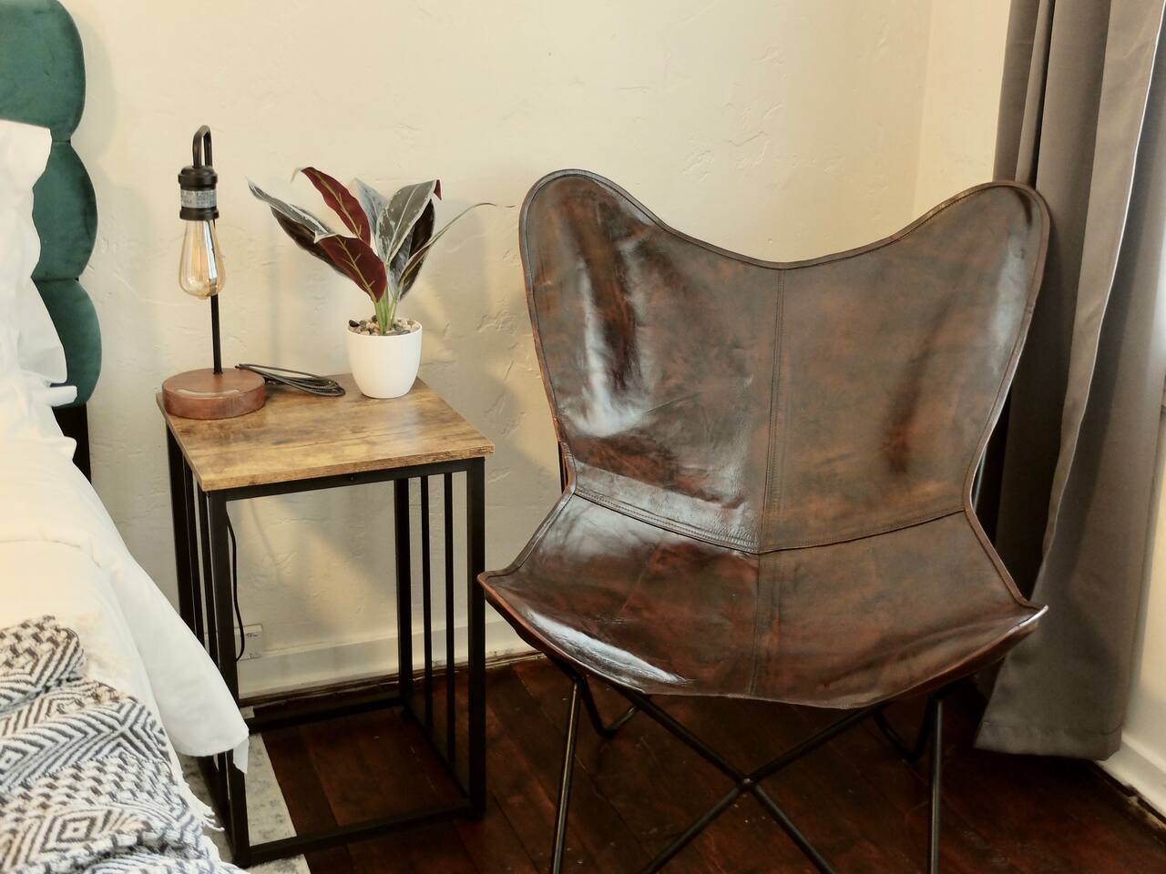 This studio takes a classical hotel room and elevates the space into a cozy, New York City-style studio! Complete with light touches of artwork and greenery, this location has the pleasant feel of an elegant apartment. Upon entry, the raised, foam-mattress, king-sized bed is the most impressive feature of the suite. The above-average sized area also comfortably fits a desk, trendy bedside chair, and well-placed television, perfectly situated for people to relax and watch beloved shows and movies! To the right of the bedroom is a bright bathroom with a tiled, walk-in shower, and to the left is a kitchen area with a bar-top, wall-installed table and two chairs. The compact refrigerator, convection oven/air fryer, hot plates, and other kitchen amenities provide a great space for guests who want to make a few meals on their own to mix things up while on vacation! Other perks of this room include: - WiFi -FireStick TV - A/C and heating unit - large wardrobe mirror - FREE on-site parking (limit: one car) - A perfectly serene location only steps away from fabulous restaurants and local shops.